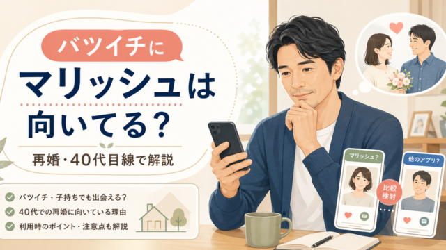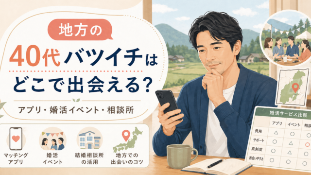 地方や田舎に住む40代バツイチ向けに、出会いの探し方を解説。マッチングアプリ、婚活イベント、結婚相談所の使い分けを紹介します。